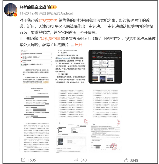 摄影师戴建峰(@Jeff的星空之旅 )11月20日发文表示,对于其起诉视觉中国销售他的照片并向他非法索赔之事,经过长达两年的诉讼,近日,天津市和平区民法院作出一审判决。一审判决确认视觉中国的侵权行为,要求其赔偿,并在官网首页上公开道歉。