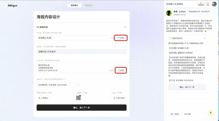 打开堆友海报Agent,不管你是不是专业设计师出身,编辑文字输入你的设计需求,在交互对话的形式中,AI设计师帮你提炼需求并转化为设计语言。