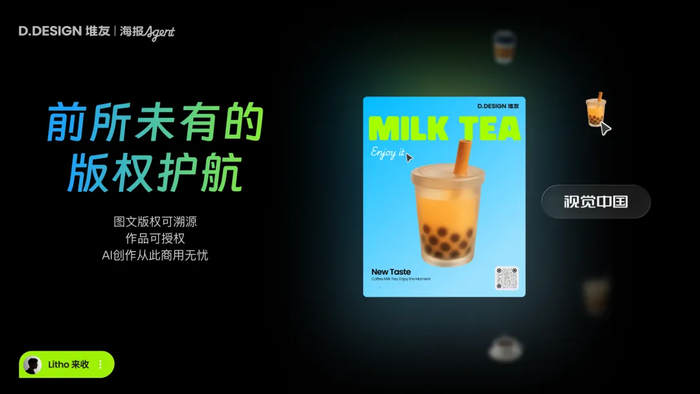 目前,视觉中国海量正版优质素材已全面接入堆友海报Agent,在更流畅的生成体验过程中,为用户提供版权溯源与授权保障,让AI创作从此商用无忧。
