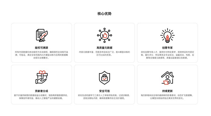 所有数据均经过专业的内容清洗、质量审核与结构化标注,确保内容质量与训练适用性。在合规方面,所有素材均来自版权方合法授权,具备完整的版权追溯链条,实现全流程合规可验证,全面支持全球AI大模型训练与商业化应用中的数据治理与合规要求。