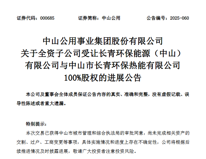 中山公用表示,将严格按批复推进付款、资产交割、工商变更登记等后续事宜,并及时披露进展。公司同时提示,交易尚未完成交割过户,实施进度仍存在不确定性,投资者需注意风险。