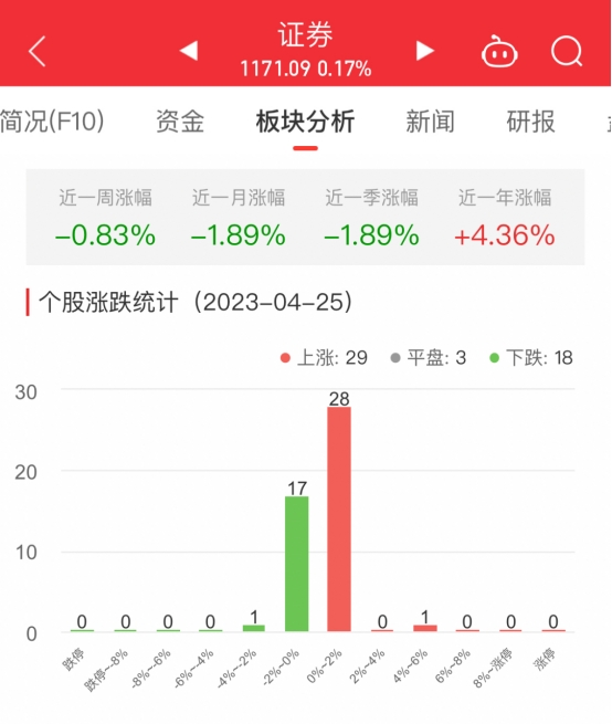 中国经济网北京4月25日讯今日,证券板块整体涨幅0.17%,其中29只股票上涨,3只股票平盘,18只股票下跌。