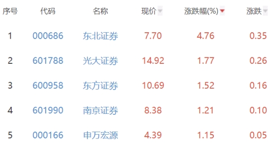 其中,东北证券、光大证券、东方证券、南京证券、申万宏源位列板块涨幅前五位,涨幅分别为4.76%、1.77%、1.52%、1.21%、1.15%。