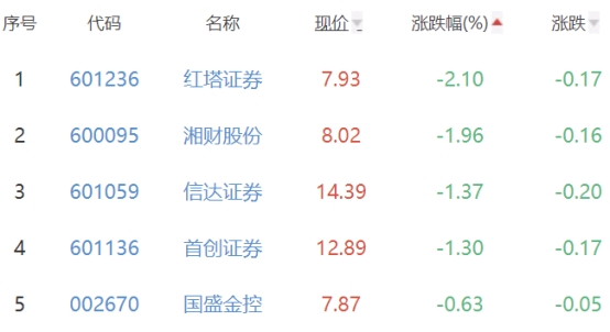 红塔证券、湘财股份、信达证券、首创证券、国盛金控位列涨幅榜后五位,涨幅分别为-2.10%、-1.96%、-1.37%、-1.30%、-0.63%。