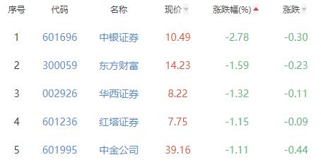 中银证券、东方财富、华西证券、红塔证券、中金公司位列涨幅榜后五位,涨幅分别为-2.78%、-1.59%、-1.32%、-1.15%、-1.11%。