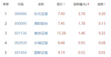 其中,东北证券、湘财股份、首创证券、长城证券、国联证券位列板块涨幅前五位,涨幅分别为2.78%、1.78%、1.46%、0.95%、0.55%。