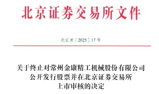 北交所于2023年6月30日受理了金康精工提交的公开发行相关申请文件,并按照规定进行了审核。2025年2月21日,金康精工向北交所提交了《常州金康精工机械股份有限公司关于撤回向不特定合格投资者公开发行股票并在北京证券交易所上市申请文件的申请》,根据《北京证券交易所向不特定合格投资者公开发行股票并上市审核规则》第五十五条的有关规定,北交所决定终止金康精工公开发行股票并在北京证券交易所上市的审核。
