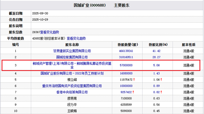 截至2025年9月30日,国城矿业主要股东中,鲸域资产管理(上海)有限公司-鲸域腾晟私募证券投资基金持股5.06%,为第3大股东。