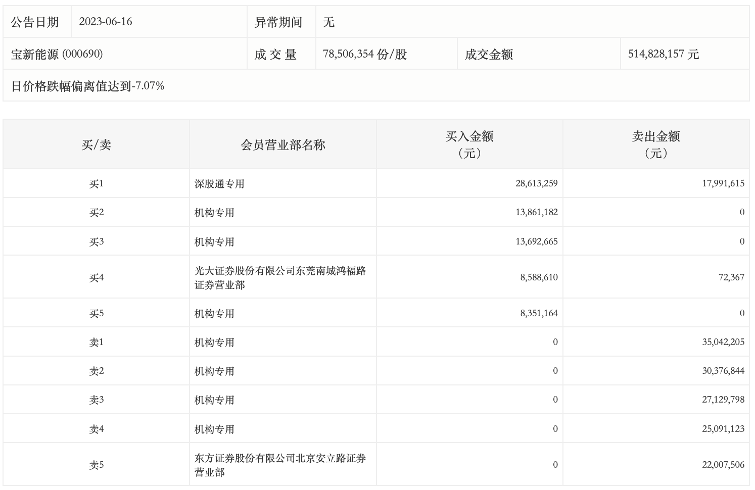 6月16日,宝新能源今日跌6.08%,成交额5.15亿元,换手率3.61%,盘后龙虎榜数据显示,深股通专用席位买入2861.33万元并卖出1799.16万元,三机构净买入3590.50万元,四机构净卖出1.18亿元。