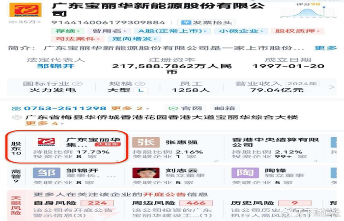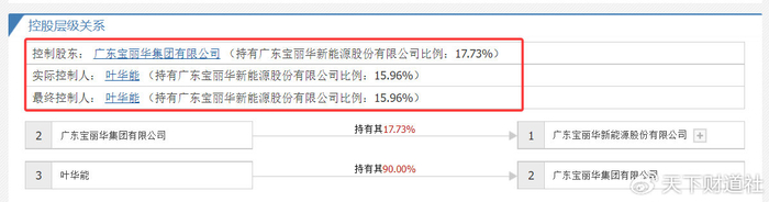 从股权结构上看,宝新能源第一大股东是广东宝丽华集团有限公司,而叶华能是后者的大股东,占比高达90%。由此,叶华能也成为宝新能源的实控人。