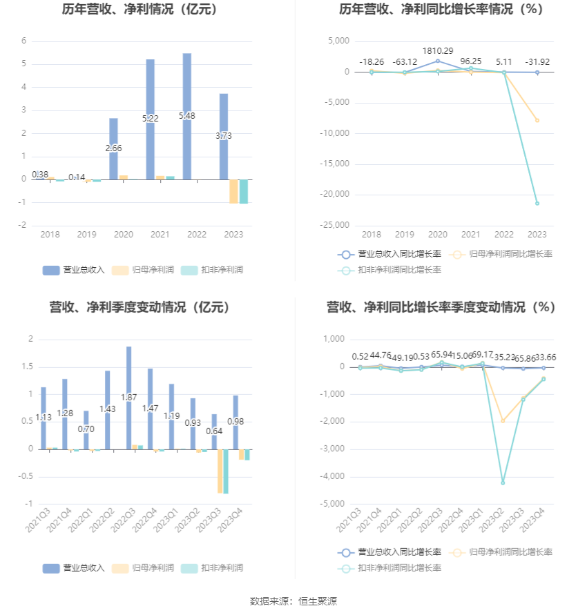 2023年,公司毛利率为12.04%,同比下降4.21个百分点;净利率为-30.77%,较上年同期下降33.79个百分点。从单季度指标来看,2023年第四季度公司毛利率为-4.98%,同比下降23.45个百分点,环比下降24.02个百分点;净利率为-26.88%,较上年同期下降27.58个百分点,较上一季度上升107.73个百分点。