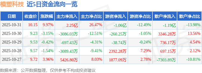 证券之星消息,模塑科技10月31日涨停收盘,收盘价10.15元。该股于13点1分涨停,2次打开涨停,截止收盘封单资金为2927.53万元,占其流通市值0.31%。