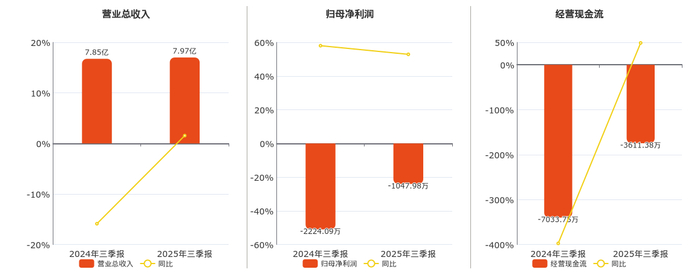 公司营业总收入为7.97亿元,较去年同报告期营业总收入增加1217.11万元,同比较去年同期上涨1.55%。归母净利润为-1047.98万元,较去年同报告期归母净利润增加1176.11万元,实现4年连续上涨。经营活动现金净流入为-3611.38万元,较去年同报告期经营活动现金净流入增加3422.37万元。