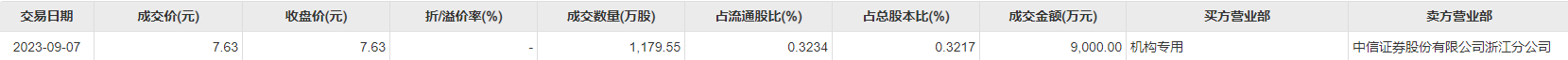 9月7日大宗交易成交1179.55万股,成交额9000万元,占当日总成交额的38.02%,成交价7.63元,较市场收盘价7.63元持平。
