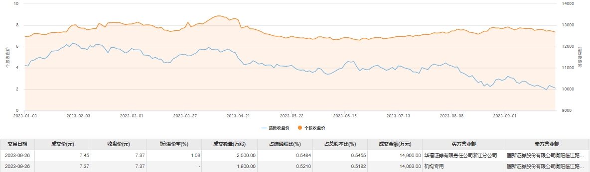 9月26日大宗交易成交3900万股,成交额2.89亿元,占当日总成交额的81.14%,成交均价7.41元,较市场收盘价7.37元溢价0.54%,其中最高成交价7.45元,最低成交价7.37元。