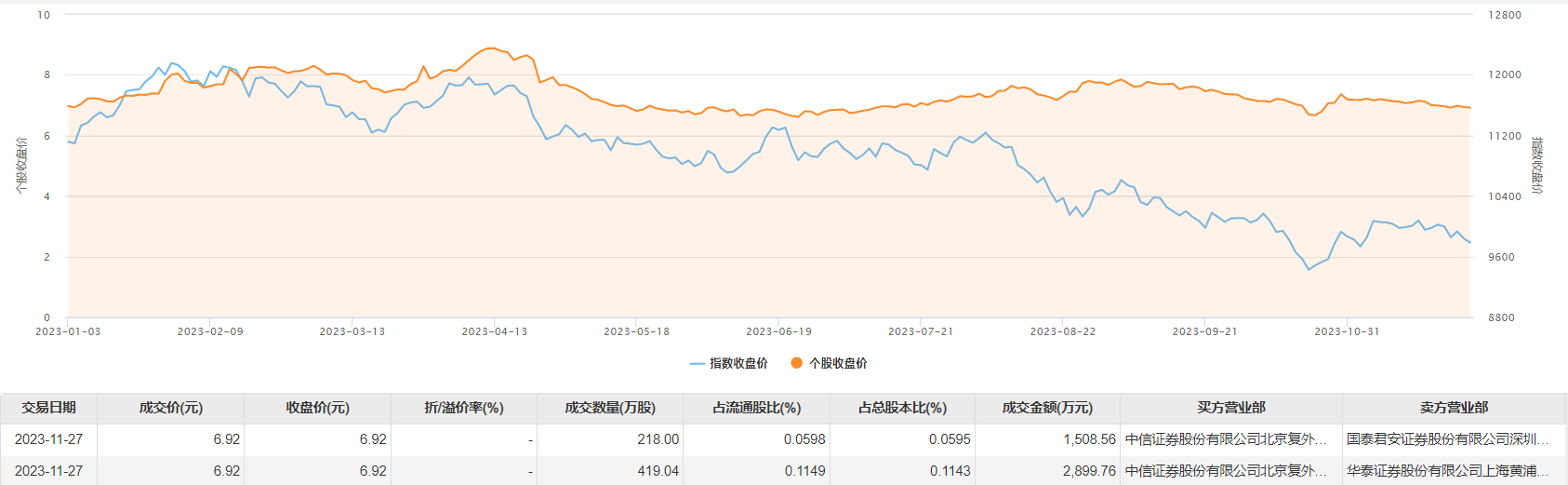 11月27日大宗交易成交637.04万股,成交额4408.32万元,占当日总成交额的51.86%,成交价6.92元,较市场收盘价持平。