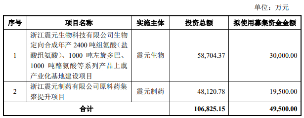 浙江震元2025年7月3日披露的2024年向特定对象发行股票募集说明书(修订稿)显示,本次向特定对象发行股票拟募集资金总额不超过49,500.00万元,并以中国证监会关于本次发行的注册批复文件为准。本次发行的募集资金在扣除发行费用后将用于以下项目:“浙江震元生物科技有限公司生物定向合成年产2400吨组氨酸(盐酸组氨酸)、1000吨左旋多巴、1000吨酪氨酸等系列产品上虞产业化基地建设项目”、“浙江震元制药有限公司原料药集聚提升项目”。