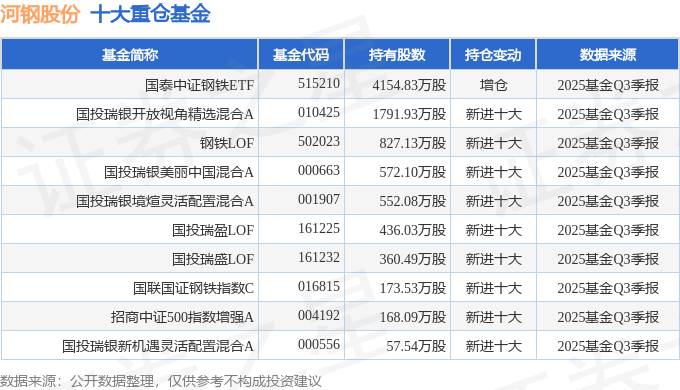 持有河钢股份最多的基金为国泰中证钢铁ETF,目前规模为36.6亿元,最新净值1.466(10月29日),较上一交易日上涨0.69%,近一年上涨25.79%。该基金现任基金经理为吴中昊。