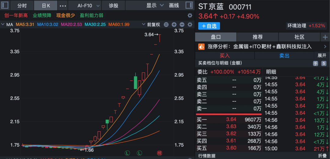 2月26日,ST京蓝(维权)(000711)再度涨停,股价升至3.64元/股,市值约为104亿元。从1月26日至今的短短一个月内,ST京蓝股价涨超110%,其间多个交易日涨停。