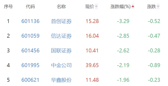 首创证券、信达证券、国联证券、中金公司、华鑫股份位列涨幅榜后五位,涨幅分别为-3.29%、-2.85%、-2.62%、-2.19%、-1.96%。
