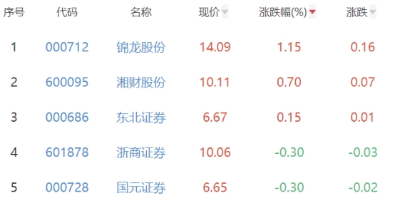 其中,锦龙股份、湘财股份、东北证券、浙商证券、国元证券位列板块涨幅前五位,涨幅分别为1.15%、0.70%、0.15%、-0.30%、-0.30%。