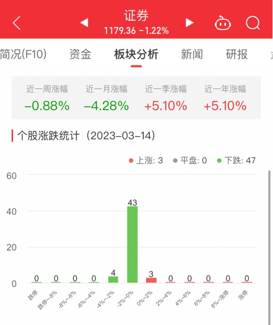 中国经济网北京3月14日讯今日,证券板块整体跌幅1.22%,其中3只股票上涨,47只股票下跌。