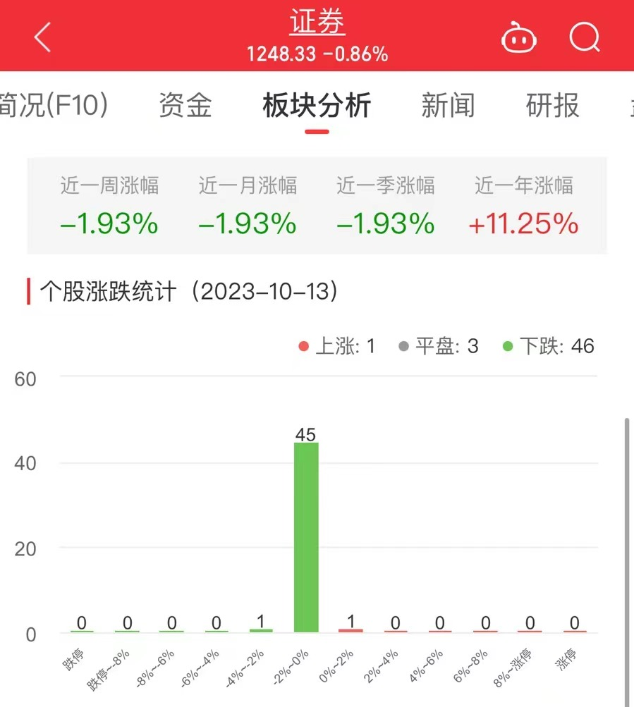 中国经济网北京10月13日讯 今日,证券板块整体跌幅0.86%,其中1只股票上涨,3只股票平盘,46只股票下跌。