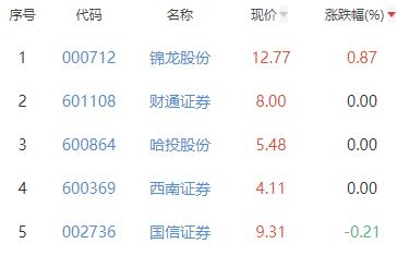 其中,锦龙股份、财通证券、哈投股份、西南证券、国信证券位列板块涨幅前五位,涨幅分别为0.87%、0.00%、0.00%、0.00%、-0.21%。