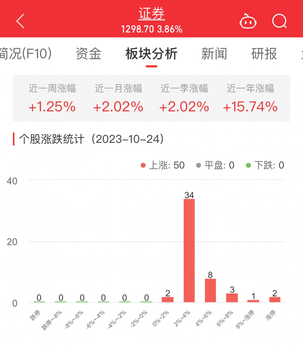 中国经济网北京10月24日讯 今日,证券板块整体涨幅3.86%,其中50只股票上涨。