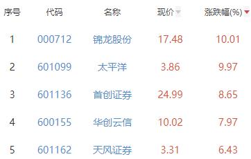 其中,锦龙股份、太平洋、首创证券、华创云信、天风证券位列板块涨幅前五位,涨幅分别为10.01%、9.97%、8.65%、7.97%、6.43%。