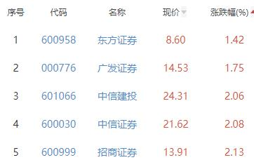 东方证券、广发证券、中信建投、中信证券、招商证券位列涨幅榜后五位,涨幅分别为1.42%、1.75%、2.06%、2.08%、2.13%。