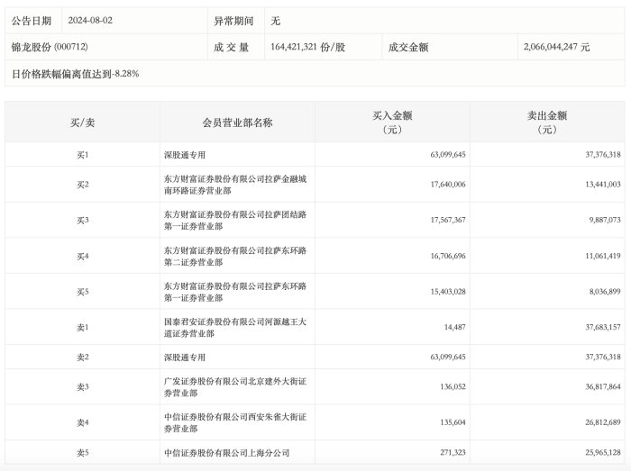 8月2日,锦龙股份今日跌9.55%,龙虎榜数据显示,上榜营业部席位全天成交3.38亿元,占当日总成交金额比例为16.36%。其中,买入金额为1.31亿元,卖出金额为2.07亿元,合计净卖出7610.73万元。
