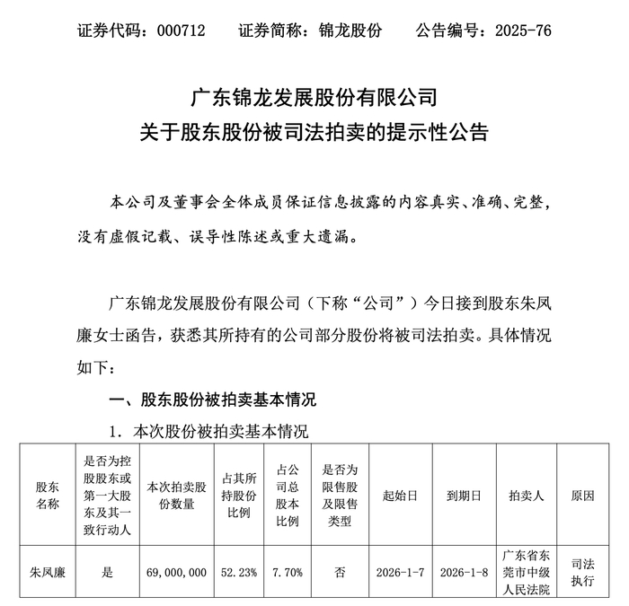 事实上,早在2025年12月8日,锦龙股份就已披露了关于股东股份被司法拍卖的提示性公告,拍卖股份为锦龙股份实际控制人杨志茂的配偶朱凤廉持有,共计6900万股,在朱凤廉所持股份中的占比高达52.23%,在公司总股本中占比7.70%。这些股份被拆分为20个标的进行拍卖,其中19个标的各350万股,另一个标的为250万股,仅有两个标的成功拍出:曹贤斌以2774.25万元竞得250万股,王梓旭以3883.95万元竞得350万股,剩余18个标的全部流拍,涉及股份达6300万股。