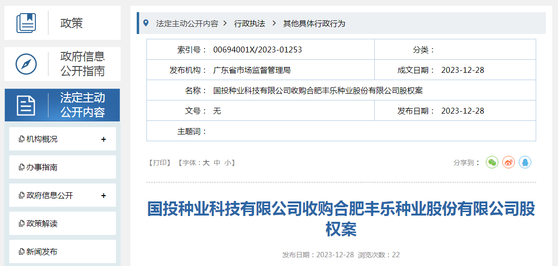 国投种业科技有限公司收购合肥丰乐种业股份有限公司股权案