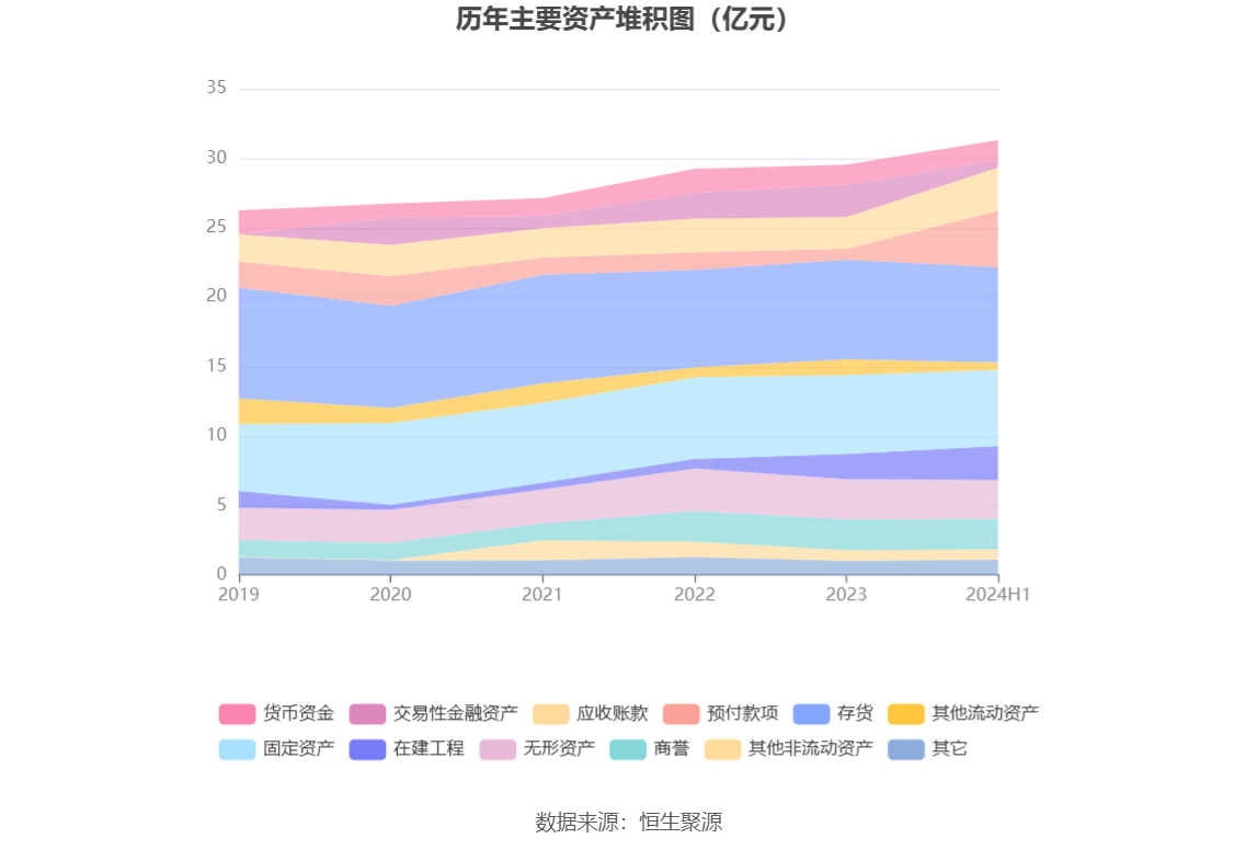 资产重大变化方面,截至2024年上半年末,公司预付款项较上年末增加410.49%,占公司总资产比重上升10.31个百分点;交易性金融资产较上年末减少76.45%,占公司总资产比重下降6.09个百分点;存货较上年末减少4.26%,占公司总资产比重下降2.37个百分点;应收账款较上年末增加36.39%,占公司总资产比重上升2.20个百分点。