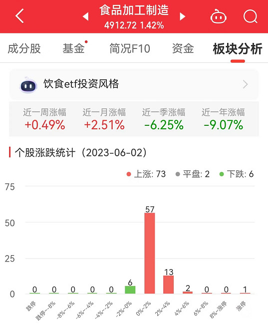 中国经济网北京6月2日讯 今日,食品加工制造板块整体涨幅1.42%,其中,73只股票上涨,2只股票平盘,6只股票下跌。