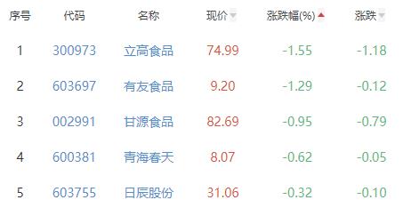 立高食品、有友食品、甘源食品、青海春天、日辰股份位列涨幅榜后五位,涨幅分别为-1.55%、-1.29%、-0.95%、-0.62%、-0.32%。