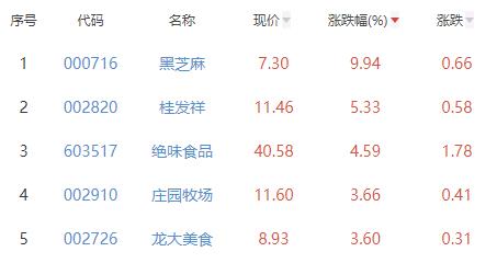 其中,黑芝麻、桂发祥、绝味食品、庄园牧场、龙大美食位列板块涨幅前五位,涨幅分别为9.94%、5.33%、4.59%、3.66%、3.60%。