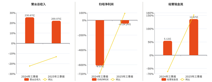 公司营业总收入为200.07亿元。归母净利润为-6724.24万元,较去年同报告期归母净利润增加7.84亿元。经营活动现金净流入为12.87亿元,在已披露的同业公司中排名第7,较去年同报告期经营活动现金净流入增加7.75亿元,同比较去年同期上涨151.47%。