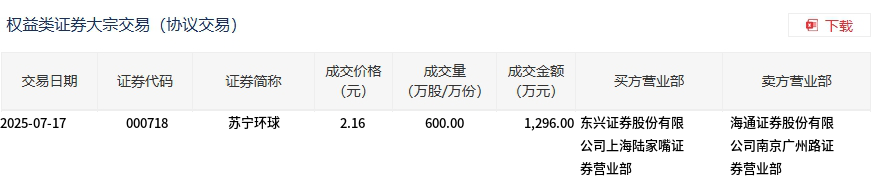 苏宁环球今日大宗交易折价成交600万股,成交额1296万元