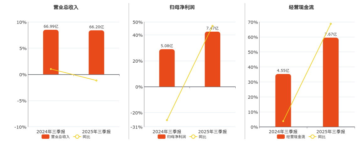 公司营业总收入为66.20亿元,在已披露的同业公司中排名第5。归母净利润为7.47亿元,在已披露的同业公司中排名第6,较去年同报告期归母净利润增加2.39亿元,同比较去年同期上涨46.94%。经营活动现金净流入为7.67亿元,在已披露的同业公司中排名第2,较去年同报告期经营活动现金净流入增加3.13亿元,实现2年连续上涨,同比较去年同期上涨68.78%。