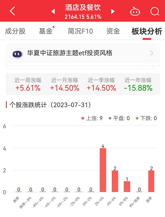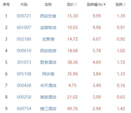 其中,西安饮食、金陵饭店、全聚德、西安旅游、君亭酒店、同庆楼、华天酒店、首旅酒店、锦江酒店涨幅分别为9.99%、9.98%、6.67%、5.78%、4.69%、3.84%、3.49%、3.09%、2.94%。