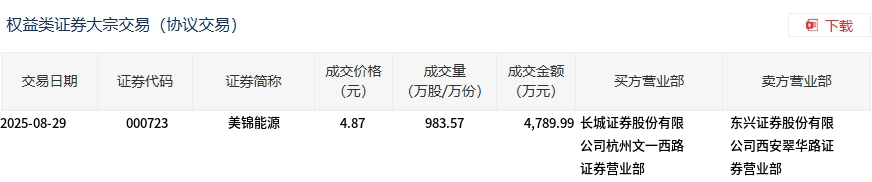美锦能源今日大宗交易溢价成交983.57万股,成交额4789.99万元