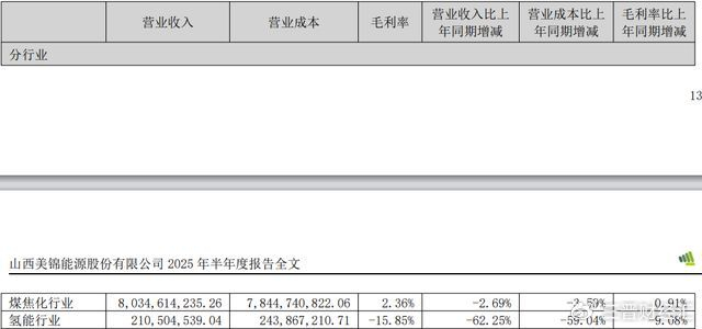 2025年上半年,美锦能源实现营收82.45亿元,同比下降6.46%;归母净利润亏损6.74亿元,同比减亏1.29%。其中煤焦化行业营收80.35亿元,占比97.45%;氢能营收2.11亿元,占比2.56%。