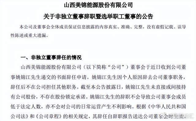 10月10日,山西A股上市公司美锦能源(000723.SZ)发布公告,公司董事姚锦江因个人原因辞去公司董事职务,辞任后不在公司担任任何职务。