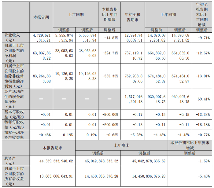 净利润表现更为承压。本报告期归属于上市公司股东的净利润为 2805.26 万元,较上年同期的-1.25 亿元(调整后)同比降幅达324.71%;扣除非经常性损益后,净利润为1912.60万元,同比降幅进一步扩大至535.35%。年初至报告期末,归属于上市公司股东的净利润为-7.37 亿元,较上年同期的-6.55亿元(调整后)亏损幅度增加12.57%;扣非后净利润为-8.33 亿元,同比亏损幅度扩大13.01%。