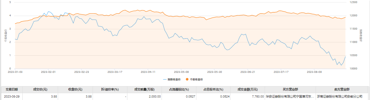 8月29日大宗交易成交2000万股,成交额7760万元,占当日总成交额的6.37%,成交价3.88元,较市场收盘价3.88元持平。