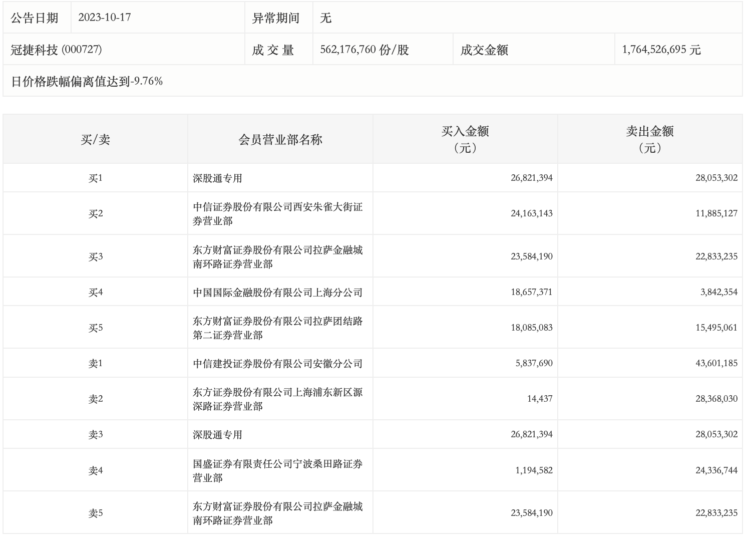 10月17日,冠捷科技今日跌9.76%,龙虎榜数据显示,上榜营业部席位全天成交2.97亿元,占当日总成交金额比例为16.82%。其中,买入金额为1.18亿元,卖出金额为1.78亿元,合计净卖出6005.71万元。
