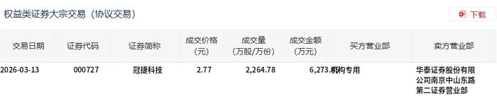 冠捷科技今日大宗交易溢价成交2264.78万股,成交额6273.45万元