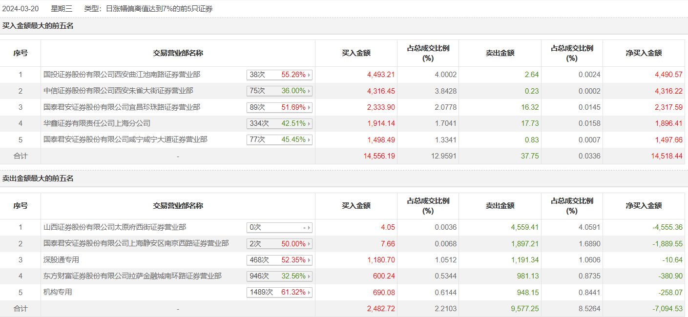 具体来看,机构买入690.08万元,卖出948.15万元,合计净卖出258.07万元。此外,知名游资现身龙虎榜,国投证券西安曲江池南路证券营业部、方新侠(中信证券西安朱雀大街证券营业部)分别买入4493.21万元、4316.45万元;山西证券太原府西街营业部、国泰君安证券上海静安区南京西路证券营业部分别卖出4559.41万元、1897.21万元。